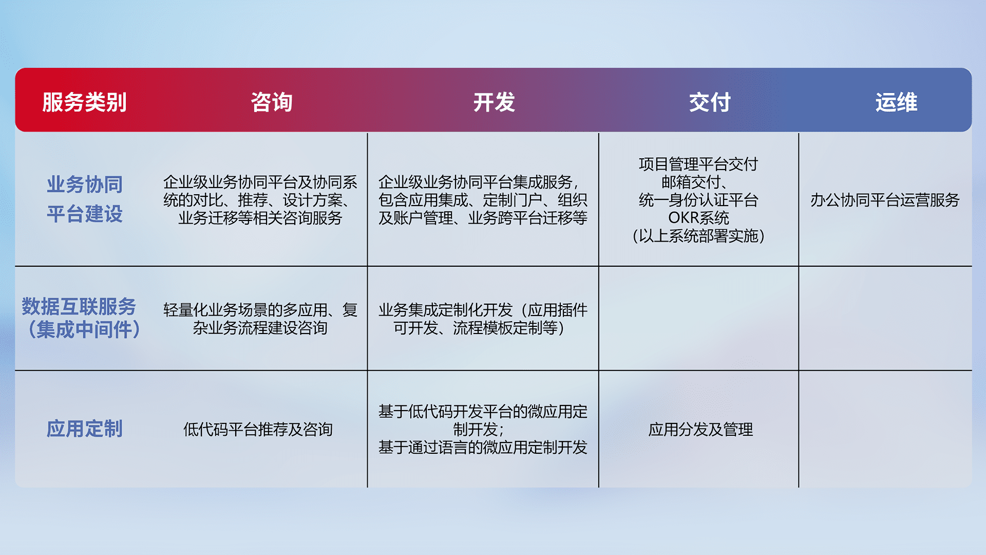 针对钉钉、、、、企微、、、IDaas等平台级产品提供产品的规划、、方案、、、交付、、定制化开发等服务,,,实现如统一协同办公、、、智能客户服务、、混合会议管理、、、、智能数据查询、、、等业务场景,,,实现数字化转型。。